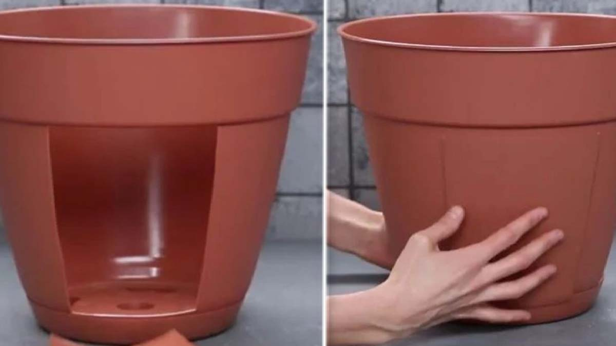 Empieza tomando una maceta de plástico de tamaño mediano y corta una parte de la maceta con un cutter.