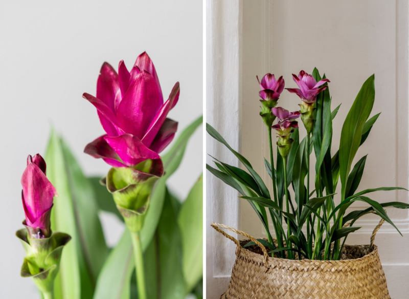 Una característica distintiva de la cúrcuma son sus hojas largas y estrechas de color verde intenso, que crecen a partir de los bulbos subterráneos, los cuales son la parte útil de la planta. De las raíces de la cúrcuma se obtiene la especia conocida por sus valiosas propiedades saludables. Sin embargo, la mayor decoración de la cúrcuma son las flores agrupadas en espigas. Aparecen en verano y suelen durar tres meses antes de marchitarse. Las flores de la cúrcuma son generalmente de color rosa o naranja.