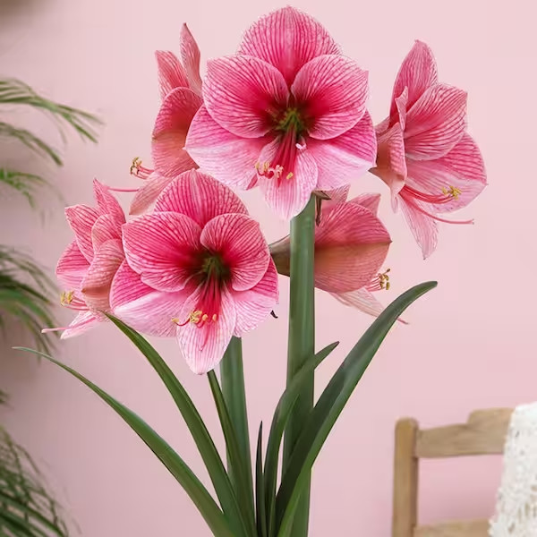 El amaryllis es una bulbosa impresionante que florece en otoño y es ideal para climas cálidos. Estas flores coloridas, similares a cohetes, ofrecen un espectáculo asombroso con 6 a 12 flores en forma de embudo sobre tallos robustos de 60 a 75 cm de altura, que crecen a partir de bulbos sin hojas. Las flores varían en color desde rosa pálido hasta magenta profundo y blanco puro. Las hojas grandes, similares a correas, siguen a las flores en otoño y no mueren hasta finales de la primavera. Los bulbos grandes entran en dormancia, se secan al sol del verano sin agua, y vuelven a florecer el otoño siguiente.