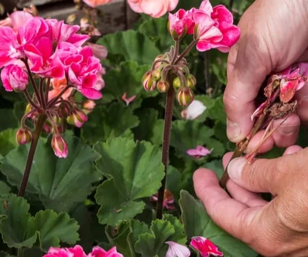 La eliminación de las flores marchitas, como en estos geranios, ayuda a allanar el camino para las nuevas flores. La podar regular puede hacer que tus flores anuales sigan floreciendo durante todo el verano.