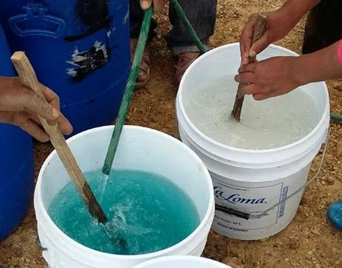 En el primer cubo de plástico, diluye el sulfato de cobre en 4 litros de agua. En el segundo cubo de plástico, prepara la «leche de cal». Pon 6 litros de agua en el cubo y añade, mientras se mezcla, los 300g de cal apagada.