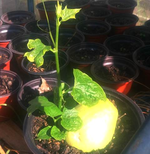 Plantar el fruto entero en una maceta de 20 cm de ancho. Colócalo en posición plana y cúbrelo con 10 cm de tierra fértil para macetas. Proporcionar una estaca para que el rodaje se aferre. Deja que la planta crezca en un lugar muy soleado y cálido, procura mantener un riego regular y no dejes que a tierra se seque. Riega con cuidado de no hacer charcos.